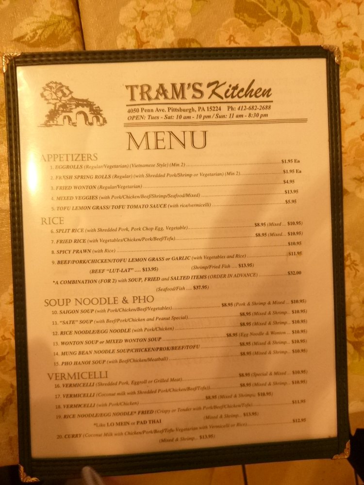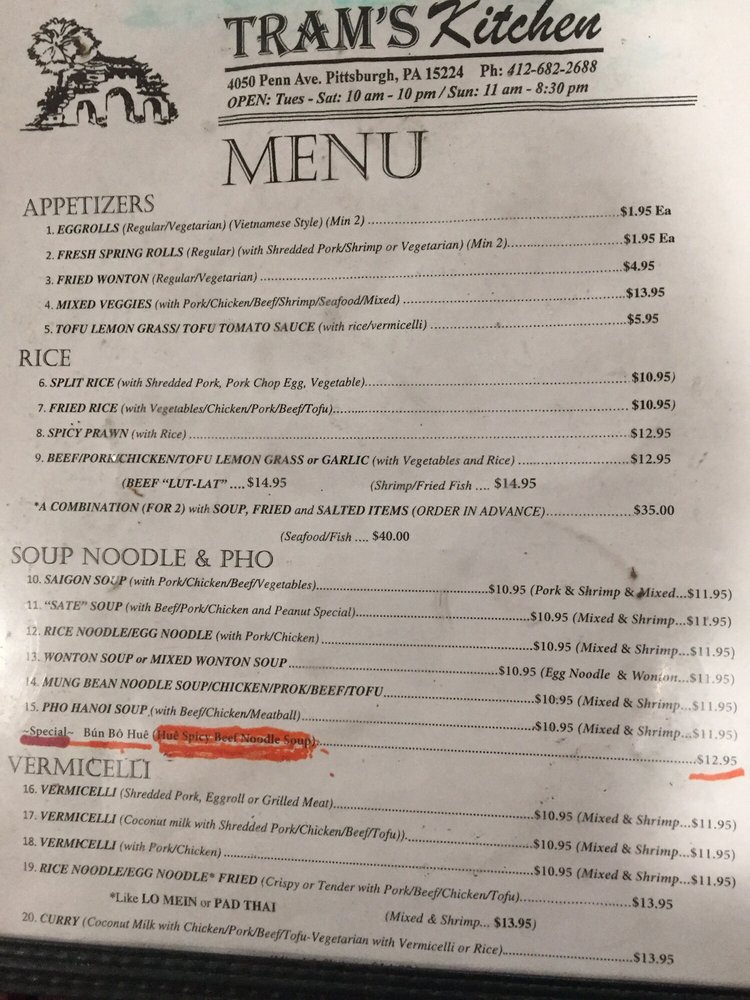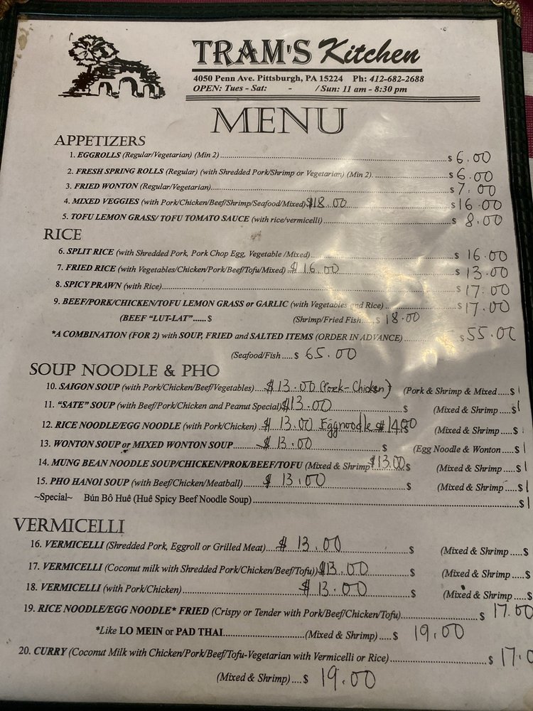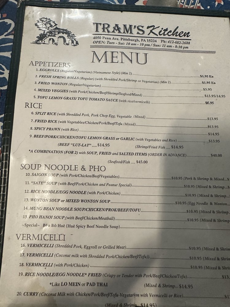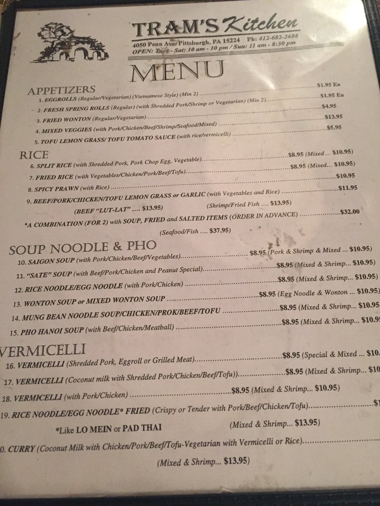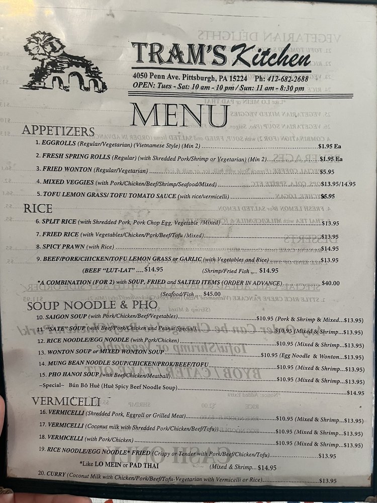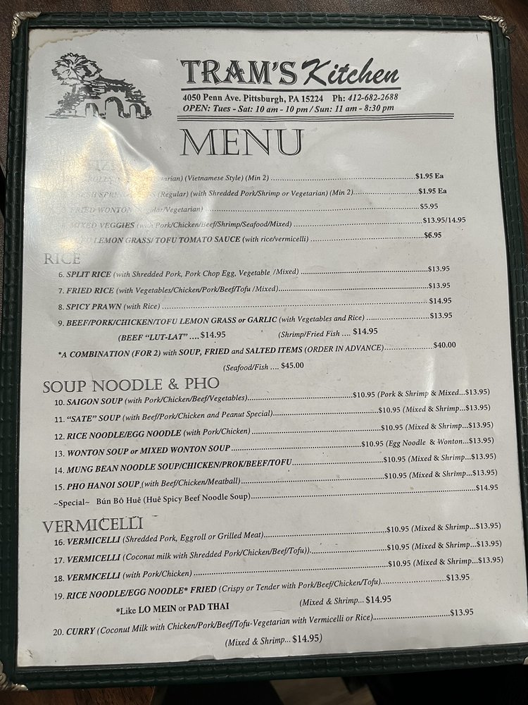 Tram's Kitchen, a Vietnamese restaurant located in Pittsburgh, offers a diverse menu with a variety of vegan and vegetarian options. The cozy atmosphere, friendly staff, and flavorful dishes have garnered rave reviews from customers over the years. Specialties like the Saigon Soup, Pho, and Lemongrass Tofu stand out for their authentic flavors and generous portions. The restaurant provides a unique dining experience with outdoor seating, Wi-Fi, and happy hour specials. Customers praise the owner's hospitality and the delicious banh mi sandwiches. Tram's Kitchen is a must-visit for those seeking traditional Vietnamese cuisine in a welcoming setting.